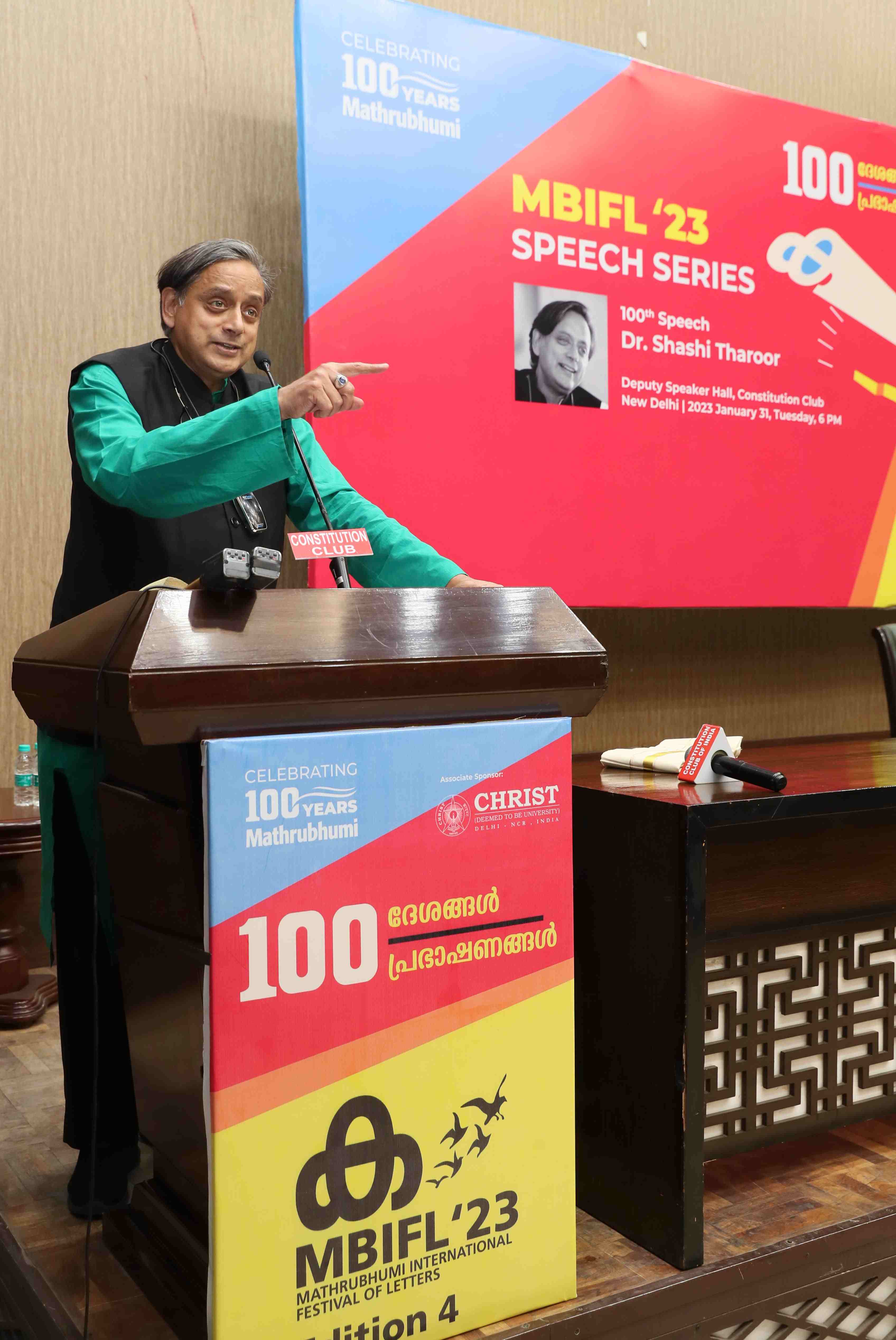 Tharoor delivers closing speech at Mathrubhumi’s “100 Speech Series”