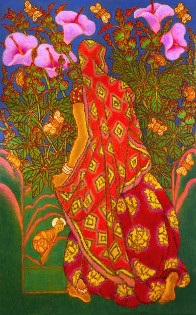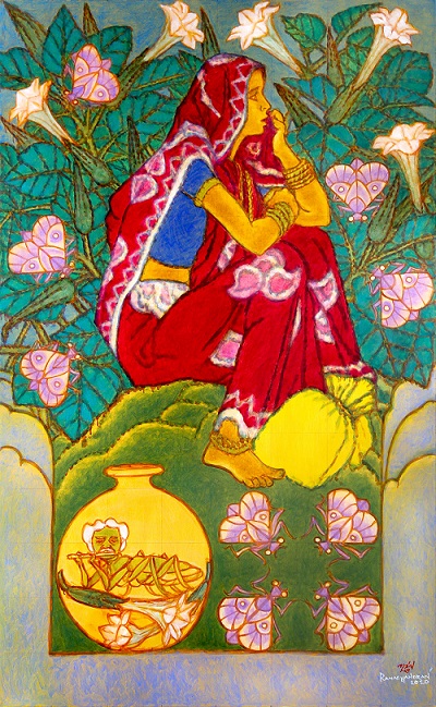 Half a century has passed since the artist has been directly familiar with the Bhil ways of life. The tribal community of Rajasthan has featured fairly regularly in Ramachandran’s artworks from the mid-1980s. The latest in the series, though, stands out for their thematic difference—this time owing to an uncanny link the rustic females bear with the haloed eight heroines from an ancient Sanskrit treatise.