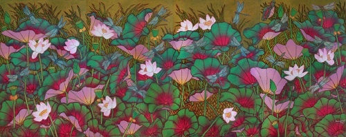 “In this case, there is a sort of forceful expression in my lotuses and the ponds. For, I had decided to spent more time than usual in my studio for days together…to keep my mind off the stories around the coronavirus,” points out the Padma Bhushan awardee, who was born in Kerala and formally trained in art at Santiniketan founded by Nobel laureate Rabindranath Tagore.“The flowers have become less delicate — the stalks are often stark. The water-bodies show more living beings…birds, insects…. They are a broader take on ecology.”