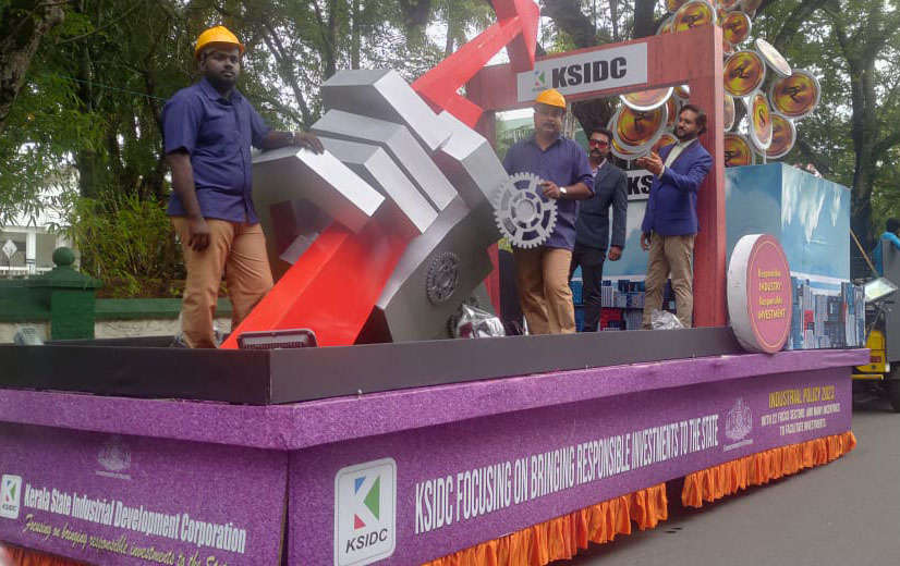 The innovatively-designed tableau vividly showcased the concept of investment by placing golden-coloured dollar models on a glittering map of Kerala. It represented 22 industries which have been given priority in the new industrial policy. Also, the upward arrow to indicate industrial growth and a cogwheel attached to it, with the fingers of the human hand grasping the arrow mark as the cogwheel rotates, evoked much curiosity among onlookers.