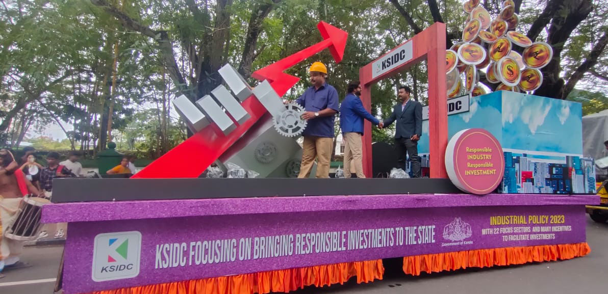 Thiruvananthapuram, Sept. 02: The Kerala State Industrial Development Corporation’s (KSIDC) tableau themed on the new policies of Industries Department, was a main attraction at the cultural pageantry of the week-long Onam celebrations, presenting the onlookers with a snapshot of the robust industrial scenario in the state.