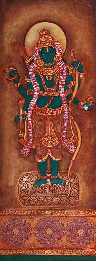 Later, into this century, Arpitha got more opportunities to visit Kerala. Be them to Kottayam or Thrissur, she would learn more about the state’s temple murals and, of course, ensure meaningful stays at the Guruvayur institute, where its first-batch student Krishnakumar had become the principal. On one such trip, veteran artist A. Ramachandran’s book, The Abode of Gods, enabled Arpitha to widen and deepen her concepts about the state’s temple paintings.