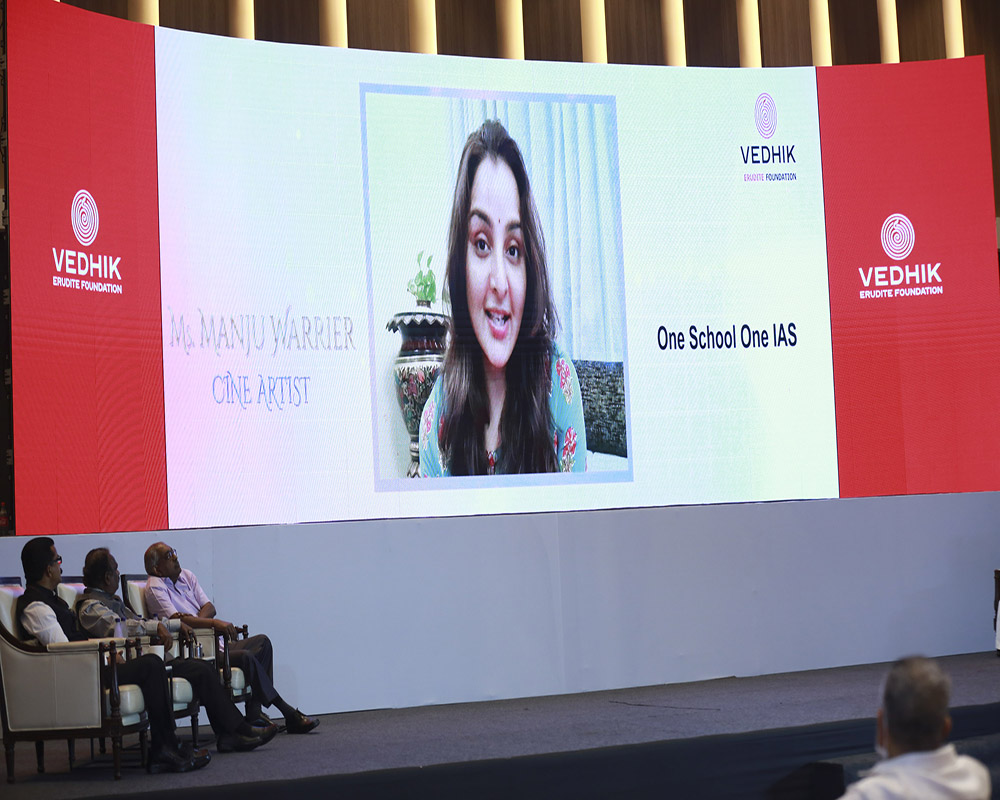 Vedhik_Manju Pic 2: Popular Film Actor Ms Manju Warrier announcing the first set of sponsorships for the Vedhik Erudite Foundation's One School One IAS programme which was inaugurated at Grand Hyatt Kochi Bolgatty on 16 January 2021.