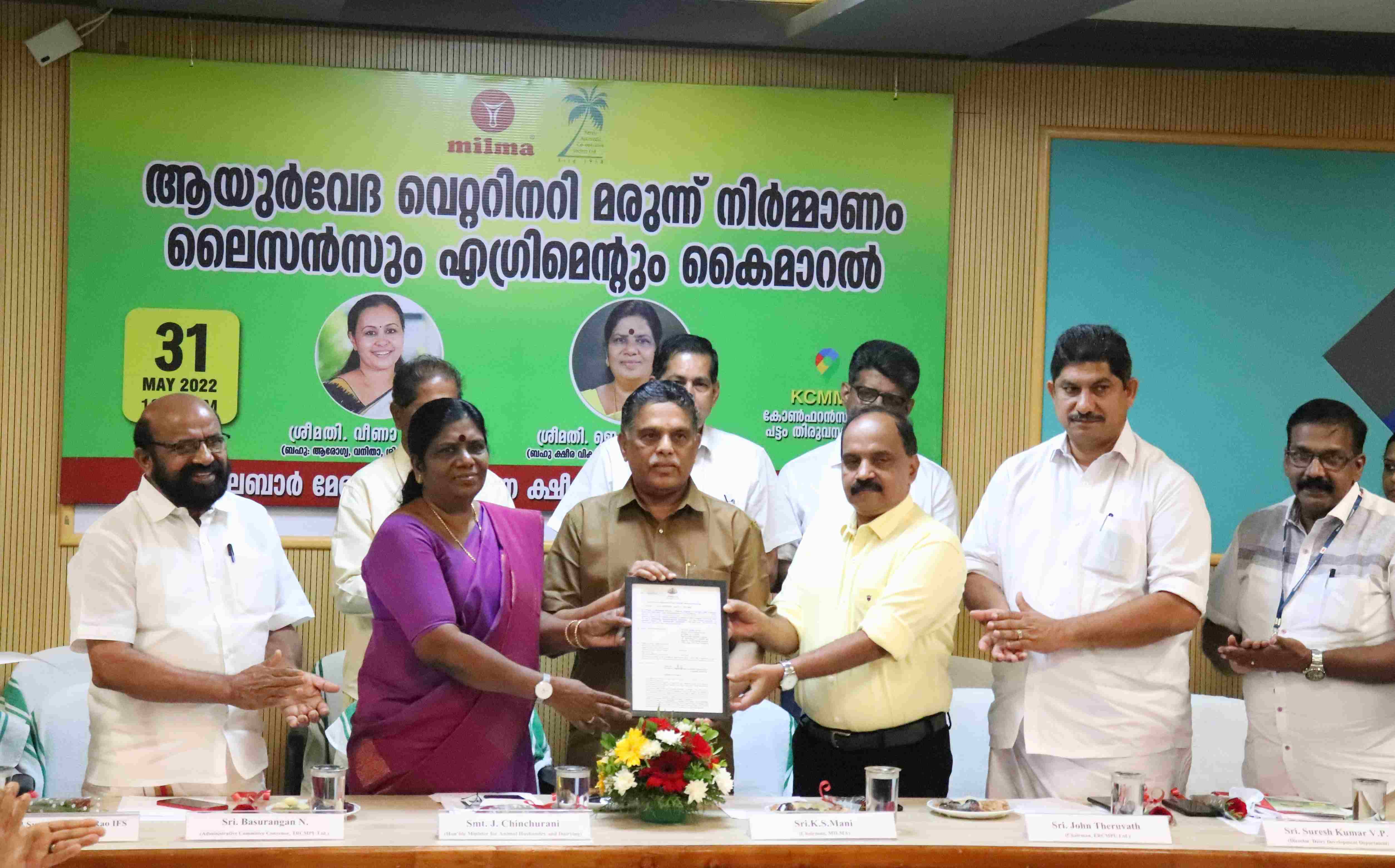മില്മ-കേരള ആയുര്വേദിക് കോ-ഓപ്പറേറ്റീവ് സൊസൈറ്റി ലൈസന്സും എഗ്രിമെന്റും മന്ത്രി ജെ.ചിഞ്ചുറാണി കൈമാറി