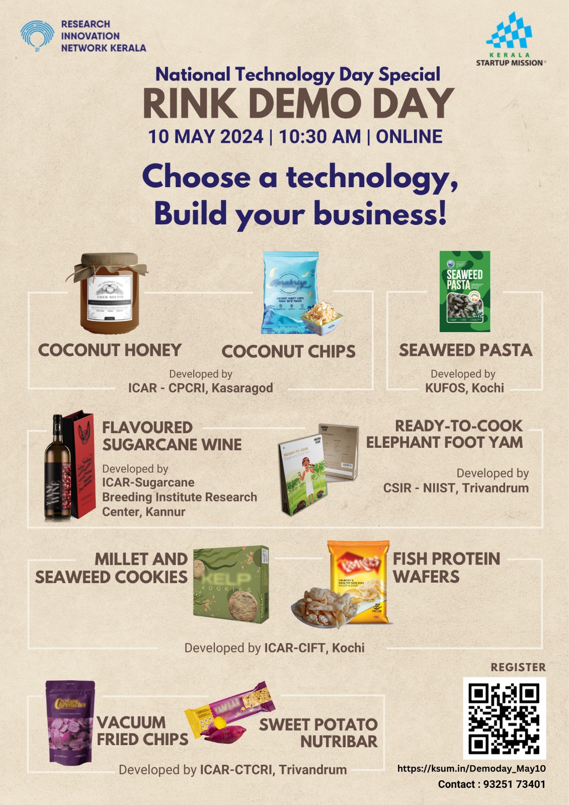 കേരളത്തിലെ ഗവേഷണ സ്ഥാപനങ്ങളില് വ്യാവസായിക സാധ്യതയുള്ള നിരവധി സാങ്കേതിക വിദ്യകള് ദിനംപ്രതി വികസിപ്പിക്കുന്നുണ്ട്. ഗവേഷകര് കണ്ടെത്തുന്ന സാങ്കേതിക വിദ്യകളെ പരീക്ഷണശാലകളില് നിന്നും വിപണിയിലെത്തിച്ച് വാണിജ്യ സാധ്യതകളെ ഉപയോഗപ്പെടുത്താന് പര്യാപ്തമാക്കുന്നതിനും പദ്ധതി ലക്ഷ്യമിടുന്നു. പ്രാരംഭ ഘട്ടം എന്ന നിലയില് കഴിഞ്ഞ വര്ഷം നടന്ന ഹഡില് ഗ്ലോബലിനോടനുബന്ധിച്ച് കേരള സ്റ്റാര്ട്ടപ്പ് മിഷന് സംഘടിപ്പിച്ച ബ്രാന്ഡിംഗ് ചലഞ്ചിലൂടെ തിരഞ്ഞെടുക്കപ്പെട്ട ഭക്ഷ്യ ഉല്പ്പന്നങ്ങള്ക്ക് പ്രമുഖ ഡിസൈനര്മാര് ബ്രാന്ഡിങ് വഴി പുതിയ മുഖം നല്കിയിരുന്നു. കേരളത്തിലെ ഗവേഷണ-വികസന സ്ഥാപനങ്ങളില് നിന്നും വികസിപ്പിച്ചെടുത്ത വാണിജ്യ സാധ്യതയുള്ള ഭക്ഷ്യ സാങ്കേതികവിദ്യകള് ഇന്നത്തെ (മേയ് 10) റിങ്ക് ഡെമോയില് പ്രദര്ശിപ്പിക്കുന്നു.