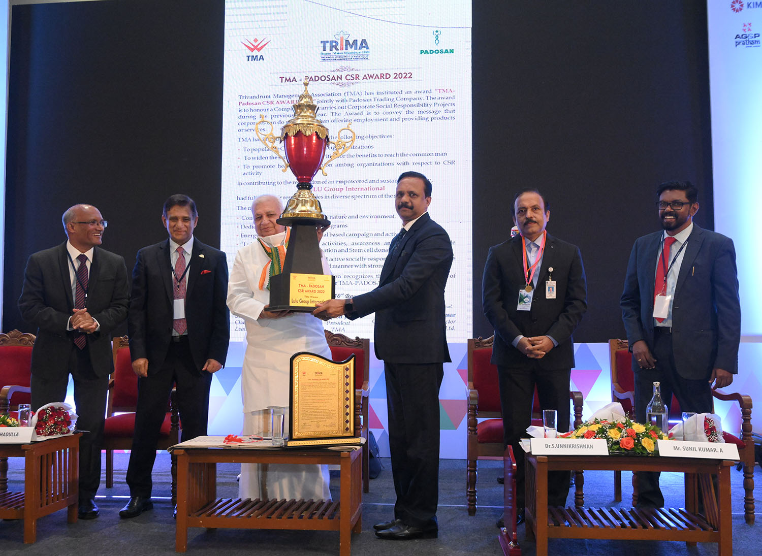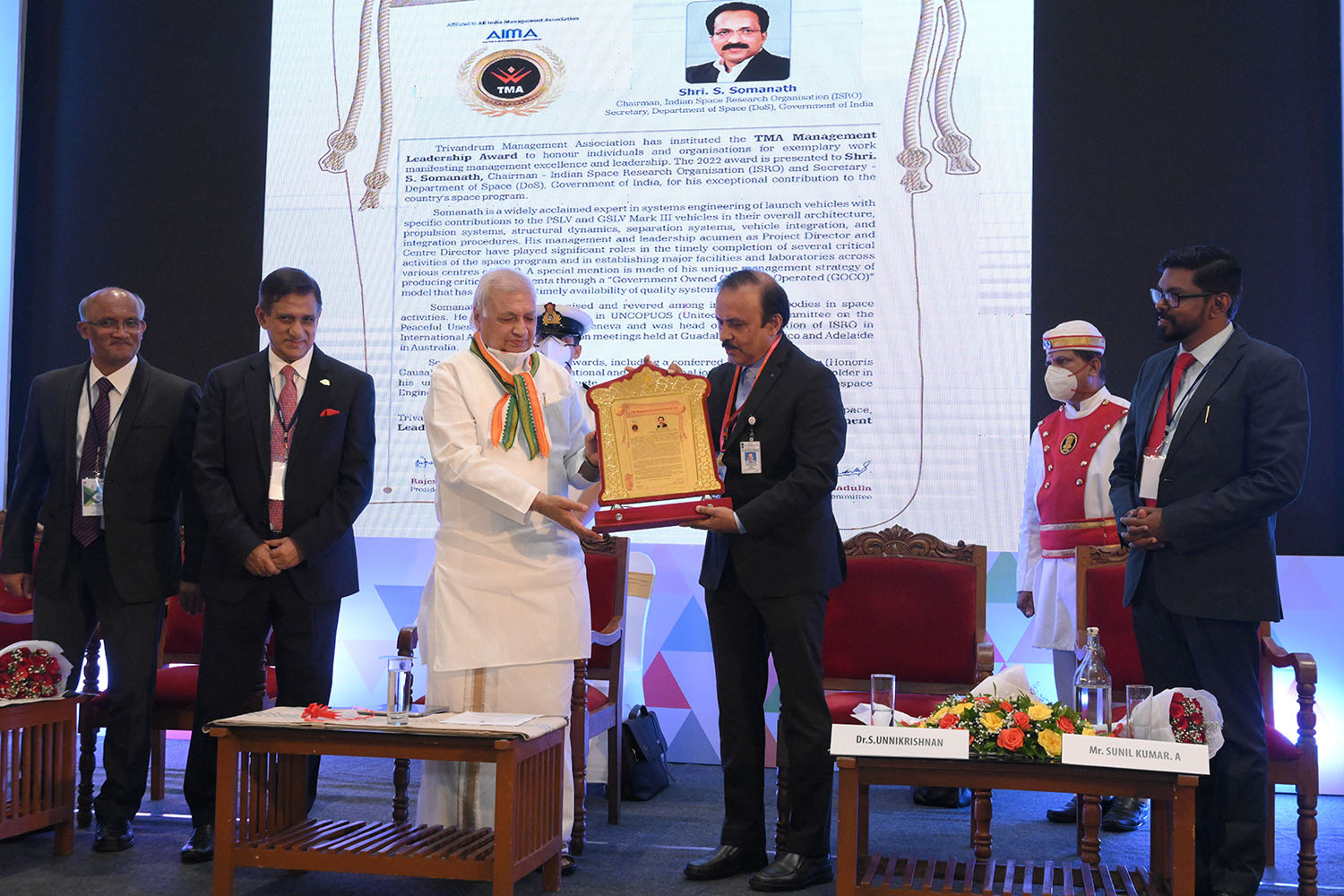 ഇന്ത്യയുടെ ബഹിരാകാശ പദ്ധതിയിലെ മികച്ച സംഭാവനകള്ക്ക് ടിഎംഎ ഏര്പ്പെടുത്തിയ മാനേജ്മെന്റ് ലീഡര്ഷിപ്പ് അവാര്ഡ് 2022 ഐഎസ്ആര്ഒ ചെയര്മാന് ഡോ.എസ്.സോമനാഥിന് വേണ്ടി വി.എസ്.എസ്.സി ഡയറക്ടര് എസ്.ഉണ്ണികൃഷ്ണന് നായര് ഗവര്ണറില് നിന്ന് സ്വീകരിച്ചു.
