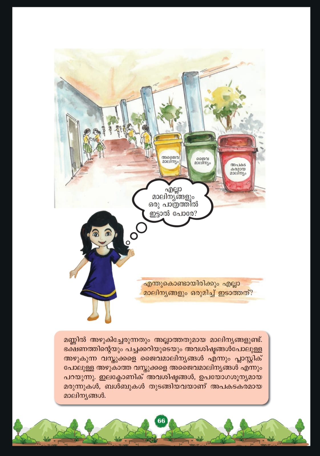 പ്ലാസ്റ്റിക് മാലിന്യങ്ങള് വലിച്ചെറിയുകയോ കത്തിക്കുകയോ ചെയ്യരുതെന്നും പാഠഭാഗത്തിലൂടെ കുട്ടികളെ ഓര്മ്മിപ്പിക്കുന്നു. സമൂഹത്തില് ശരിയായ മാലിന്യ സംസ്കരണ സംസ്കാരം വളര്ത്തുന്നതില് കുട്ടികളെ പങ്കാളികളാക്കാനും വരും തലമുറയില് മാലിന്യ സംസ്കരണ സംസ്കാരം വളര്ത്തിയെടുക്കാനും സാധ്യമാവുന്ന തരത്തിലാണ് പാഠഭാഗം ചിട്ടപ്പെടുത്തിയിട്ടുള്ളത്.