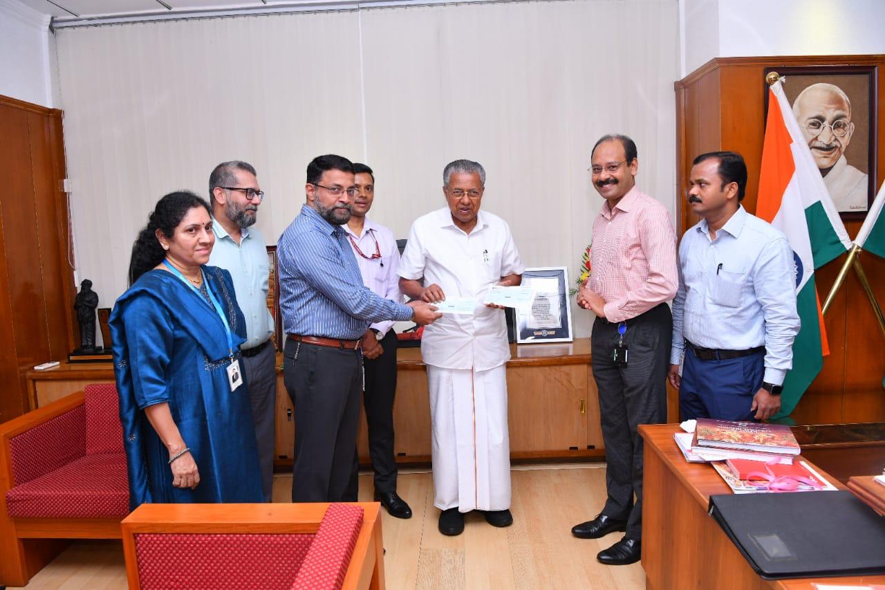 Chief Minister Shri. Pinarayi Vijayan received the cheque for Rs 2.1 crore from Col Sanjeev Nair (Retd), CEO, Technopark, and Shri Susanth Kurunthil, CEO of Infopark and Cyberpark, in the CM’s Chamber at the Secretariat here.