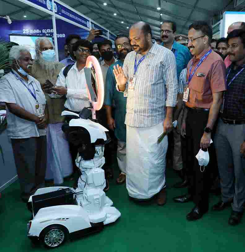 Kochi, June 16: Kerala Minister for Law, Industries and Coir Shri P. Rajeeve had a pleasant surprise at Vyapar 2002 today when a robot at the business-to-business meet invited him for a photo and came up with its print in 30 seconds after the click.