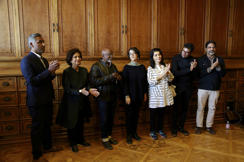 KMB20_Curator_2: From left to right: V Sunil, Secretary, Kochi Biennale Foundation; Gayatri Sinha, Art Critic & Curator; Bose Krishnamachari, Artist, President, Kochi Biennale Foundation; Shubigi Rao, Artist, Curator, Kochi-Muziris Biennale 2020; Tasneem Mehta, Managing Trustee and Honorary Director, Bhau Daji Lad Museum; Jitish Kallat, Artist, Curator, Kochi-Muziris Biennale 2014; and Sudarshan Shetty, Artist, Curator, Kochi-Muziris Biennale 2016