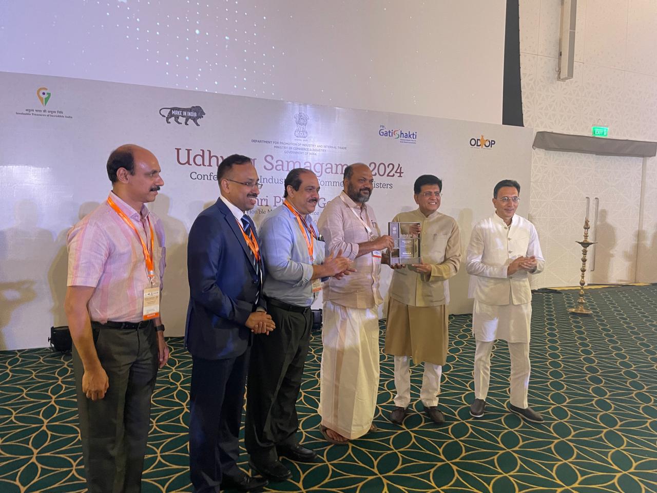 Union Minister of Commerce Shri Piyush Goyal presented the Business Reforms Action Plan ’22 (BRAP 22) award of the Department for Promotion of Industry and Internal Trade (DPIIT) to Shri P Rajeeve, Minister for Industries, Law and Coir, Government of Kerala, at the conference, Udhyog Sangam 2024.