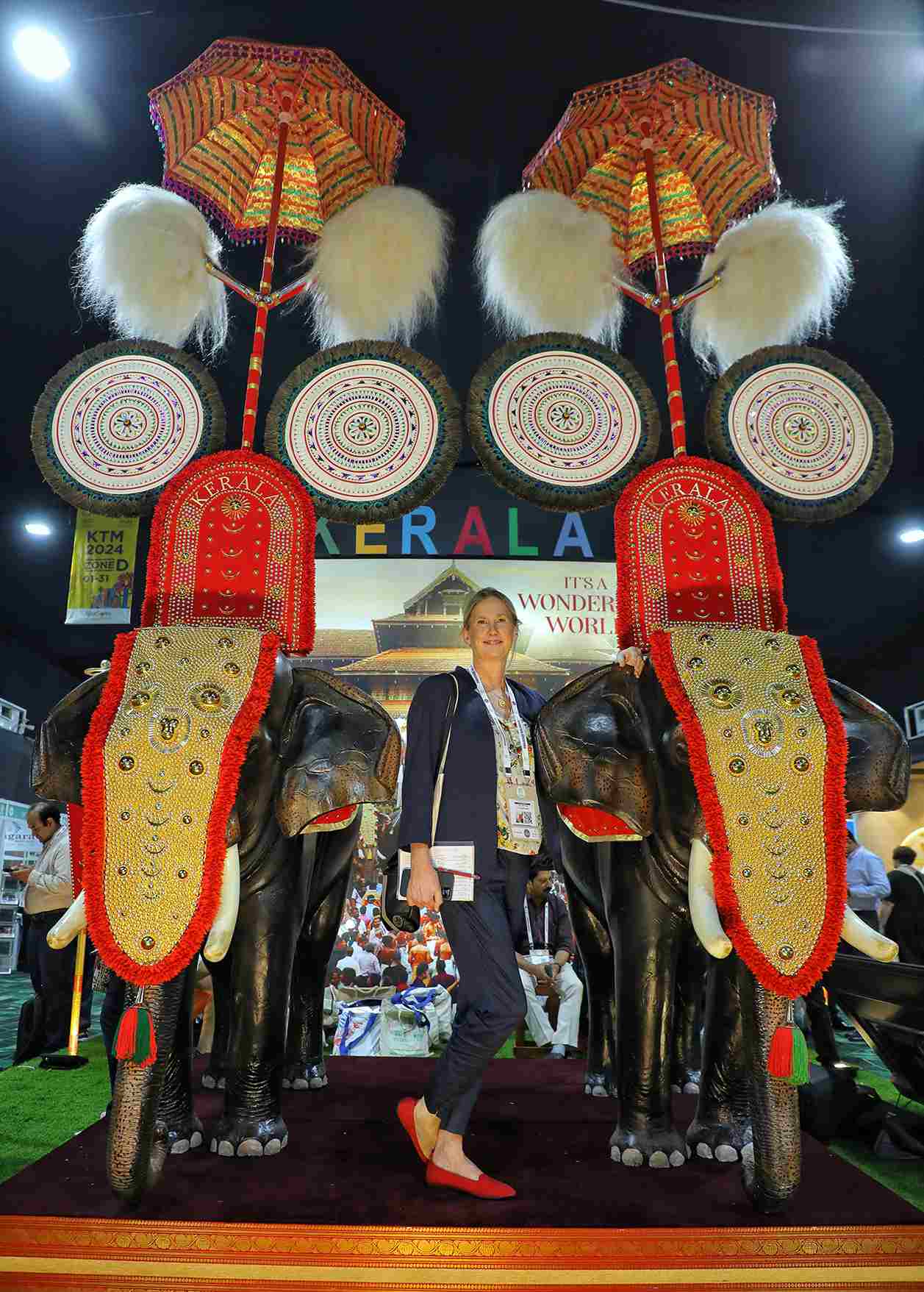 35 ചതുരശ്ര മീറ്റര് സ്ഥലത്താണ് 'കേരള ഫെസ്റ്റിവെല് ഡെസ്റ്റിനേഷന്' പവലിയന് ഒരുക്കിയിട്ടുള്ളത്. അഞ്ചരയടി വലുപ്പത്തിലുള്ളതാണ് ആനകള്. പൂരപ്പറമ്പിലെ എഴുന്നെള്ളിപ്പിനെ ഓര്മ്മിപ്പിക്കുന്ന വിധം രണ്ട് കൂറ്റന് ആനകളുടെ മാതൃകയാണ് അലങ്കരിച്ചൊരുക്കിയിരിക്കുന്നത്. നെറ്റിപ്പട്ടം കെട്ടി മുത്തുക്കുടയുടെയും ആലവട്ടത്തിന്റെയും വെഞ്ചാമരത്തിന്റെയും അകമ്പടിയോടെ നില്ക്കുന്ന ഗജരാജന്മാരുടെ തലയെടുപ്പ് കേരളീയ ഉത്സവാന്തരീക്ഷവും വിനോദസഞ്ചാര വൈവിധ്യവും എടുത്തു കാണിക്കുന്നു.