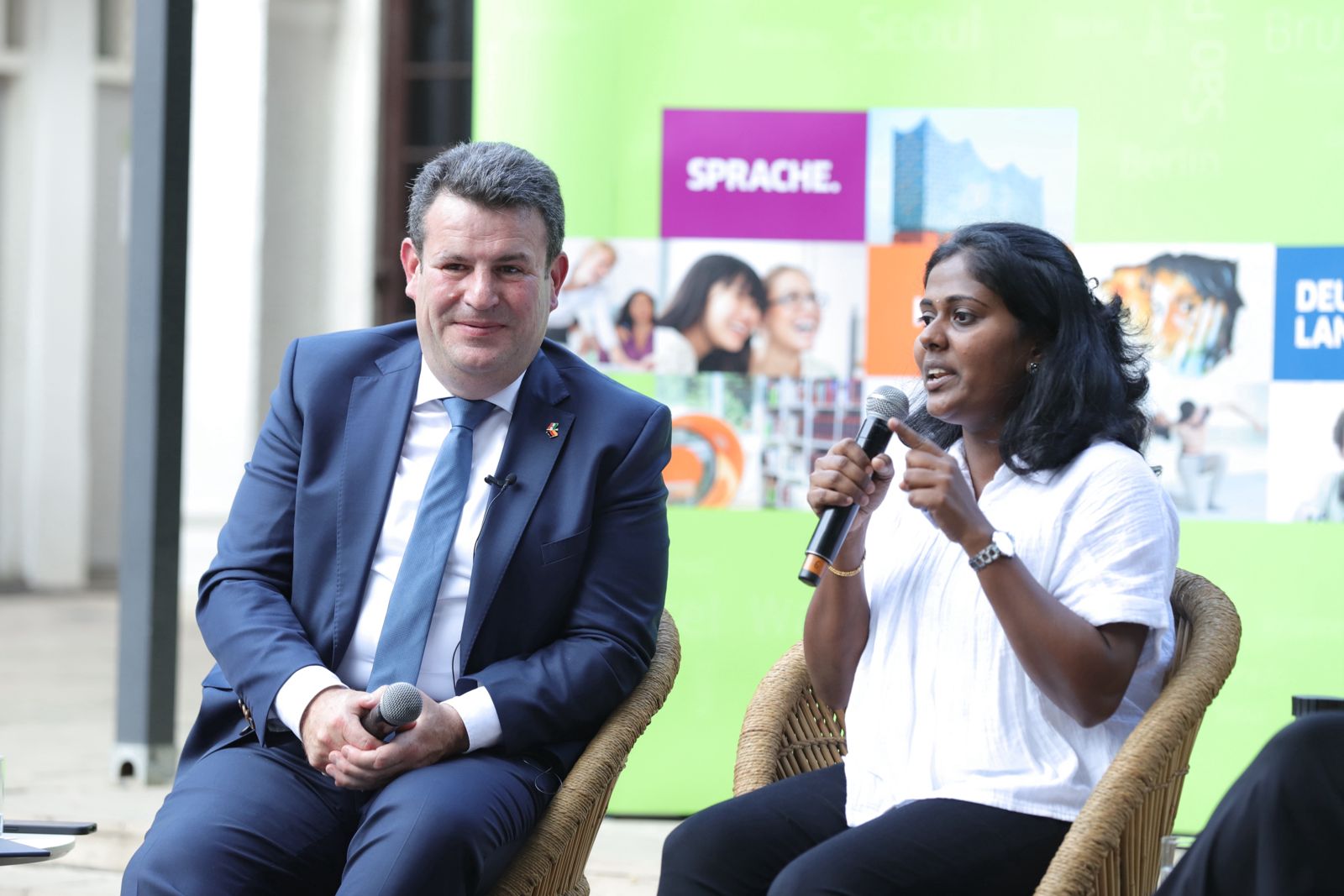ന്യൂഡല്ഹിയിലെ മാക്സ് മുള്ളര് ഭവനില് നടന്ന പരിപാടിയില് തിരുവനന്തപുരം ഗൊയ്ഥെ സെന്ട്രമില് നിന്നുള്ള മുത്തുലക്ഷ്മി പി ഉത്തമന്, അര്ച്ചന അജി എന്നിവര് മന്ത്രിമാരോട് സംവദിച്ചു. ജര്മനിയിലെ തൊഴിലവസരങ്ങള്, കുടിയേറ്റം ഉള്പ്പെടെയുള്ള വിഷയങ്ങള് ചര്ച്ചയായി.