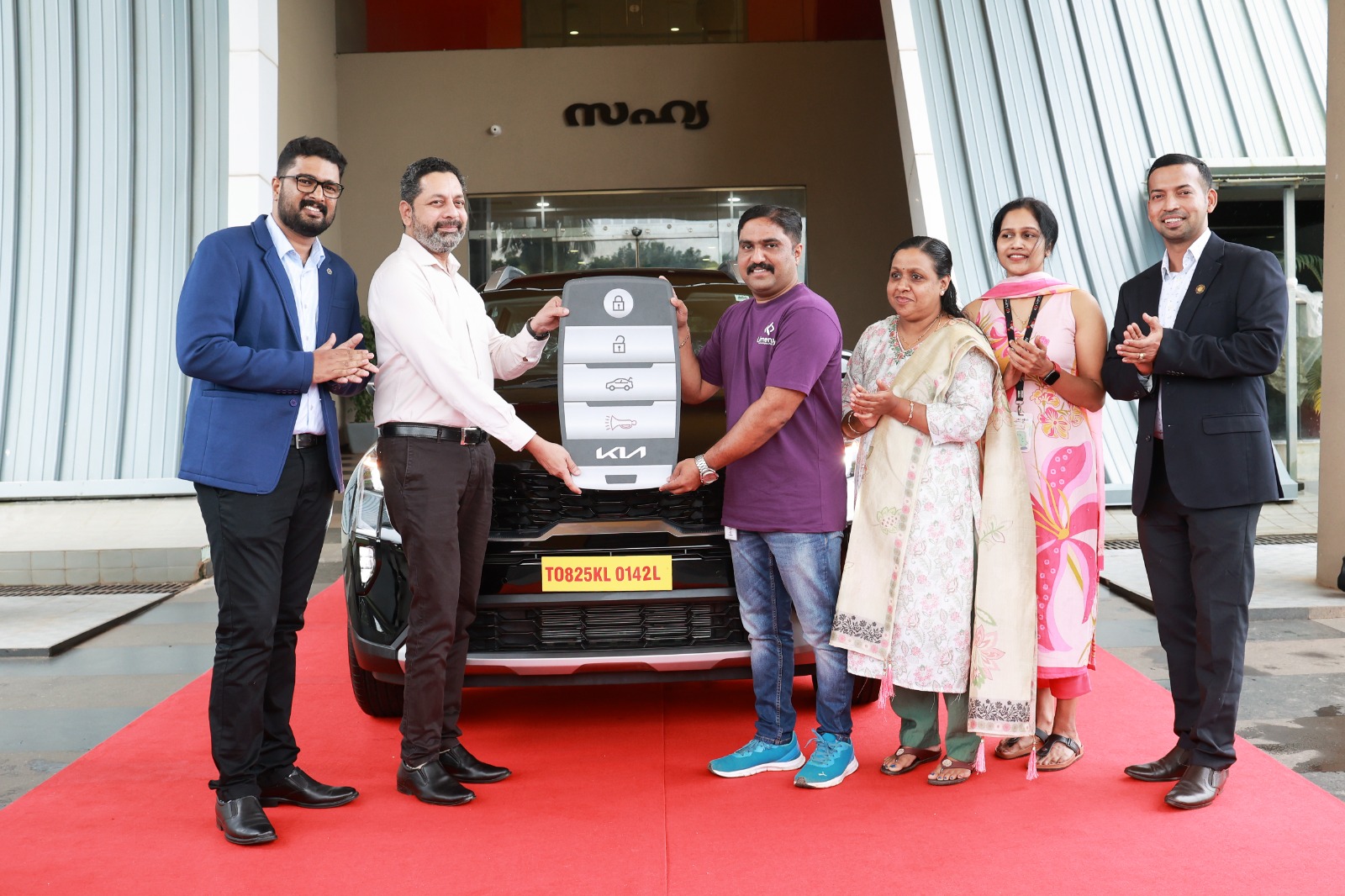 Limenzy Chief Marketing Officer Subi P won the top variant of Kia Sonet. Cyberpark General Manager Vivek Nair handed over the keys of the subcompact SUV to Subi.