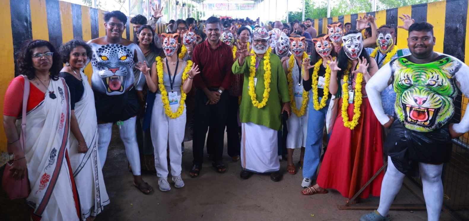 Earlier, the group was accorded a warm welcome at Sitaram Mill Lane and they had a close look at the nuanced and diligent preparations of each Puli Kali artiste prior to their performance. The group also interacted with the artistes.