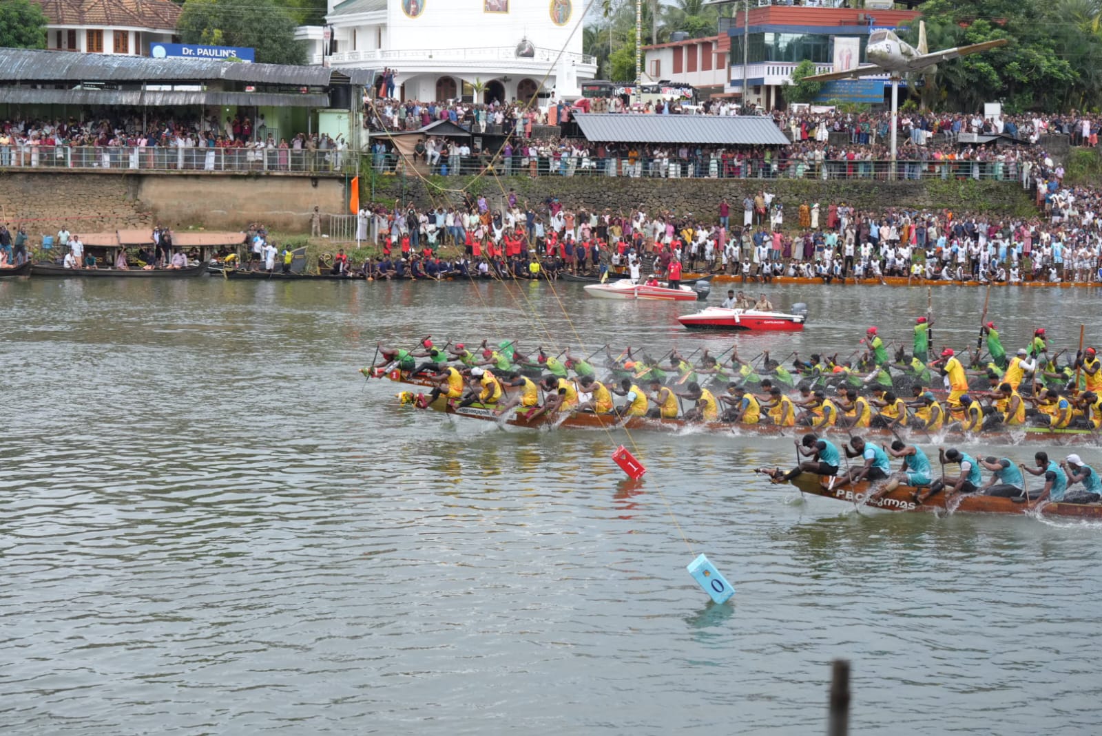 The finals of today’s race initially saw all the three teams rowing neck-and-neck for three-quarters of the water strip along the Muvattupuzha river. In the last lap, Coast Dominators and Pride Chasers rowed, by making full use of their skills and energy, leaving the spectators clueless about the winner. The photo-finish required the official results to come in for the suspense to be over.