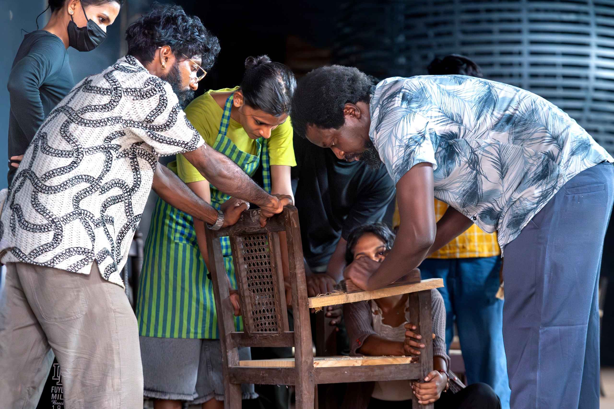 The students repaired chairs, and supervised workers hanging strung and patched-up jute bags. Says Atharv: “It was wonderful to know that making chairs as pieces of art will have a role in Parliament of Ghosts. With the help of master carpenters, Mahama taught us how to dismantle and repair chairs,” said Atharv.