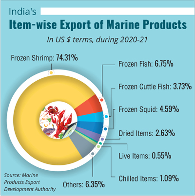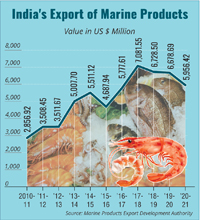2020-21 ఆర్ధిక సంవత్సరంలో 43,717.26 కోట్లరూపాయల (US $ 5.96 బిలియన్) విలువైన 11,49,341 MT సముద్రఉత్పత్తులను ఎగుమతి చేసింది. మునుపటి ఎగుమతులతో పోలిస్తే ఇది కేవలం 10.88 శాతం మాత్రమే తగ్గింది, కారణం COVID మహమ్మారి మరియు మందగించిన విదేశీమార్కెట్లు భారత సముద్రపు ఆహార ఉత్పత్తులు రంగంపై తీవ్రవైన ప్రభావం చూపడమే.