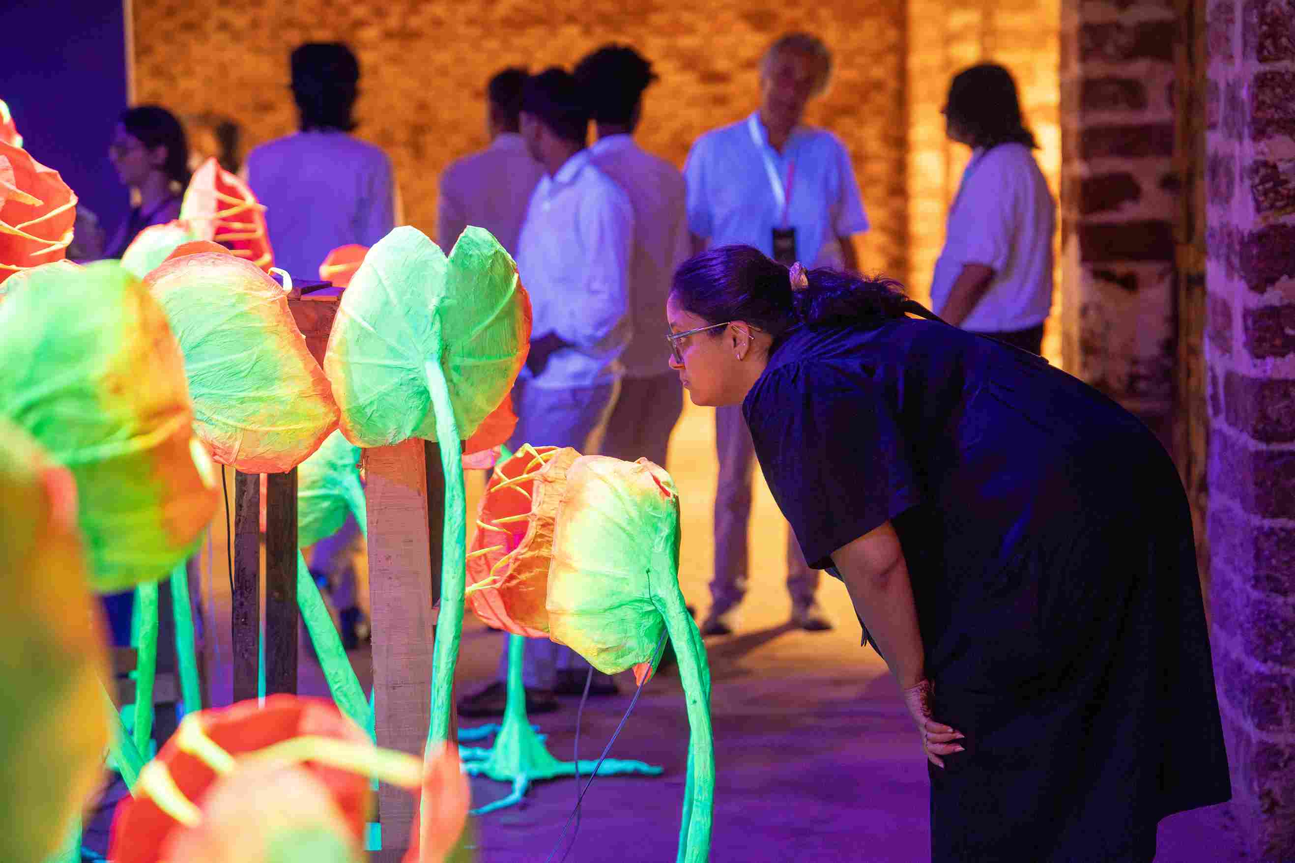 At the heart of the Biennale installation is a disconcerting garden of carnivorous plants glowing under blue UV light. Their sharp, white, tooth-like forms appear alluring from a distance, almost ornamental. But as viewers move closer, the beauty gives way to unease.