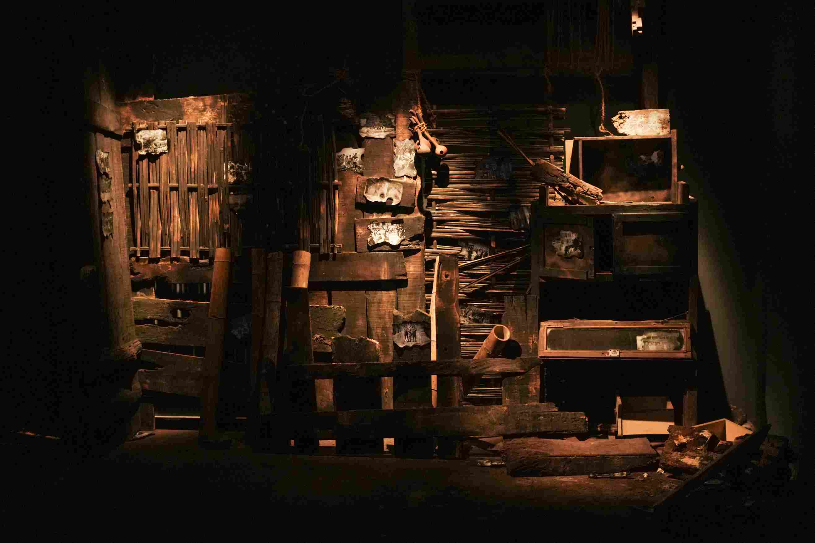 In an adjoining space, Rabha reconstructs the image of a burnt house. Scattered within it are fragments of real archival materials, newspapers, books, pamphlets, and documents related to the ULFA movement and student protests from the 1990s. While the structure itself is a recreation, the materials are authentic. “These are real documents,” Rabha clarifies. “The house is a representation, but the archives are real. Burnt houses were common during that time, from the 1990s to around 2010.”