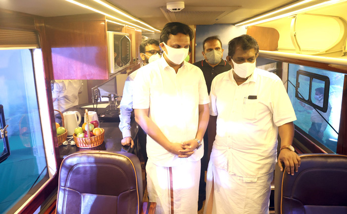 The customized stylish vehicle, equipped with all the trappings for a smooth ride and comfortable stay, was jointly launched by Tourism Minister Shri P A Mohamed Riyas and Transport Minister Shri Antony Raju at a function in the city.
